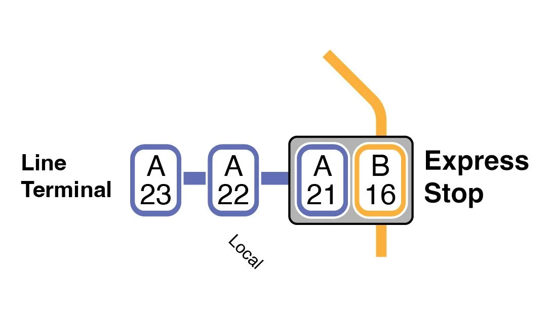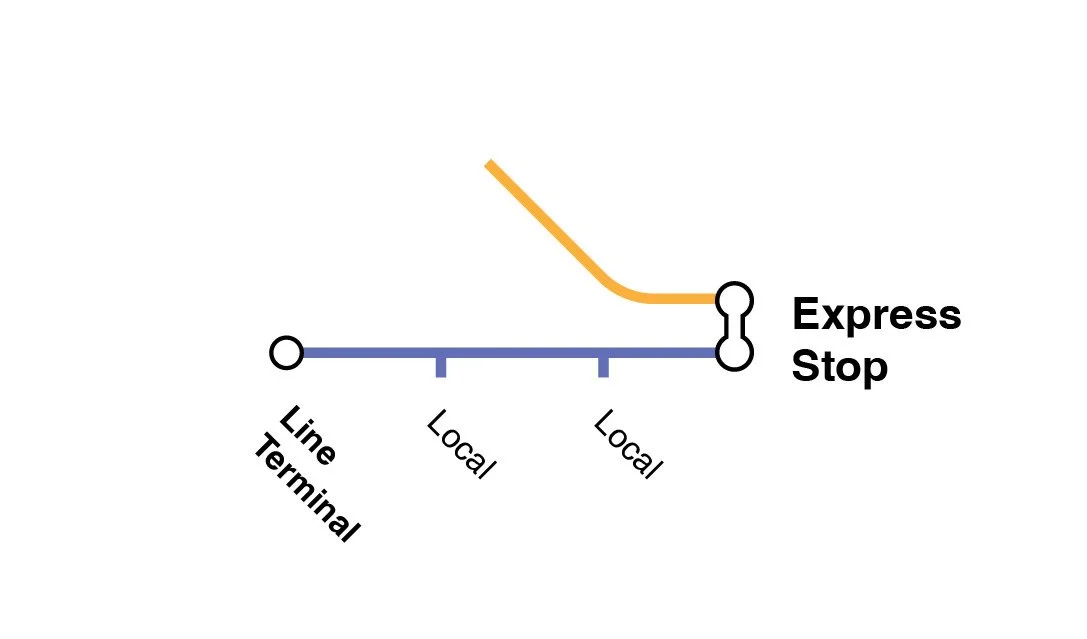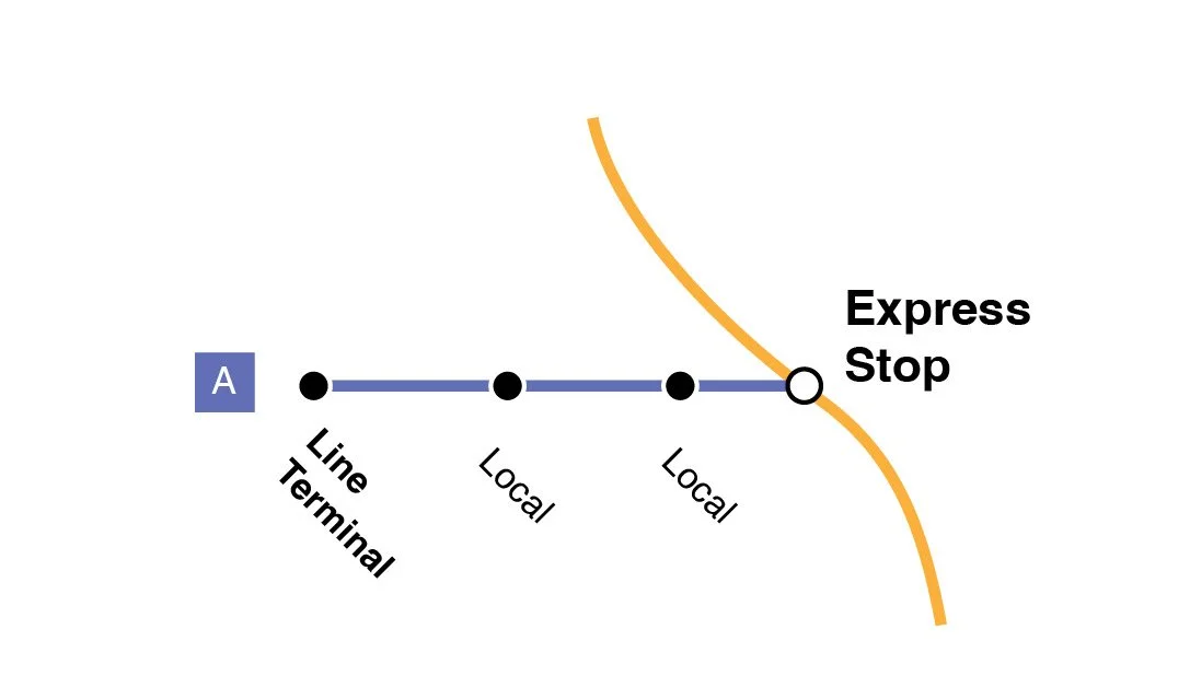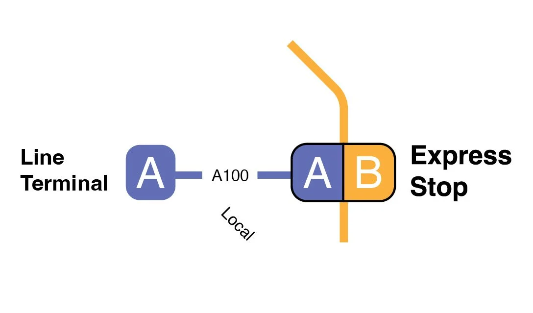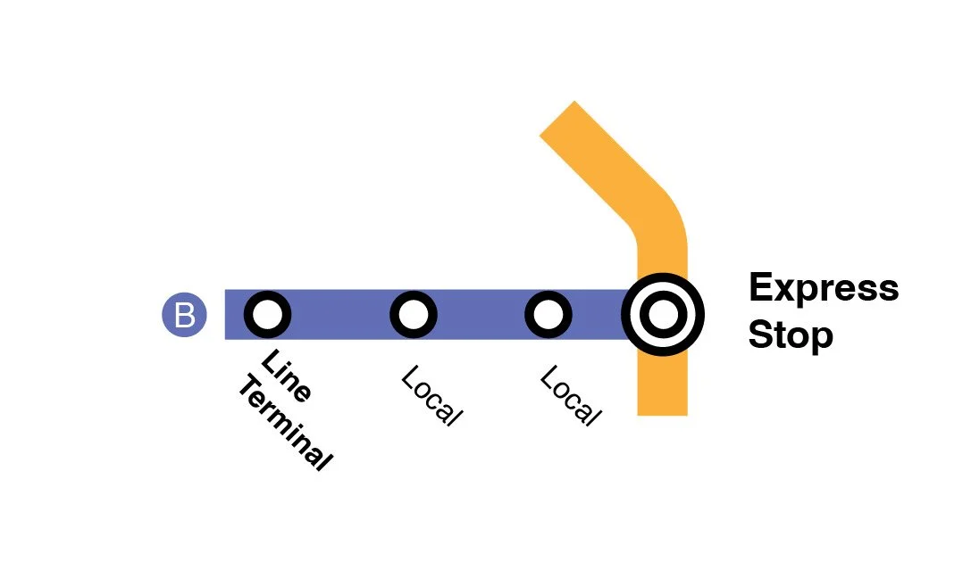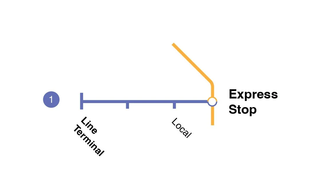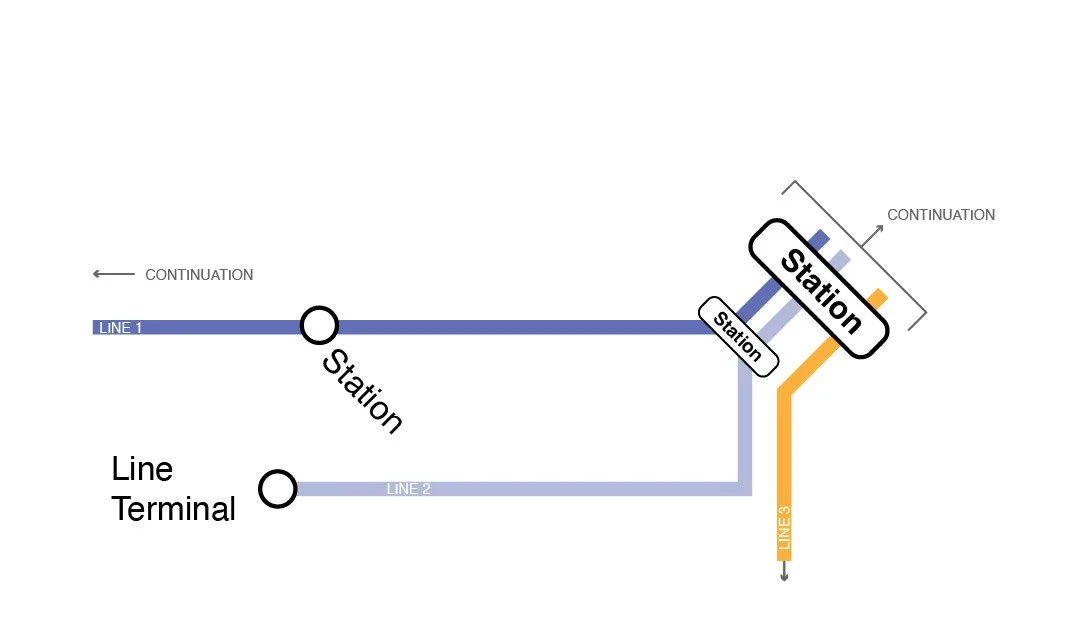 The “stops” on our subway lines had an important purpose, since the ends of each lines needed to feel bolder and more prominant than the stops in between. Most transit maps have a distinction between local stops and express or transfer stops, and our search for the right graphic solution to took us around the globe, looking at how mass transit systems organized the relevant categories of information.