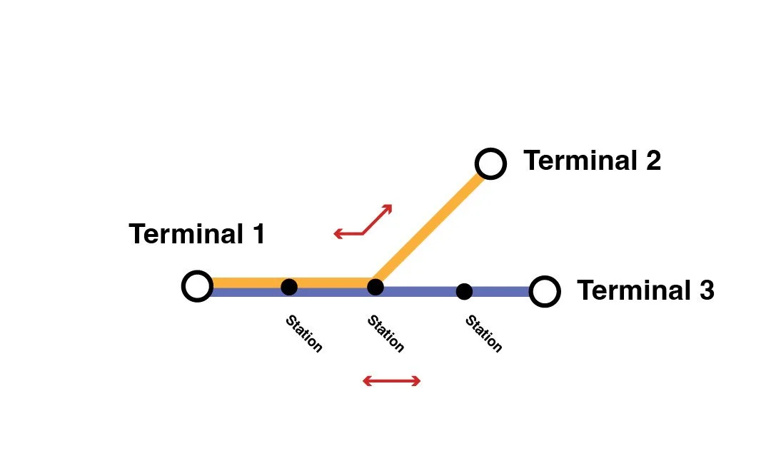 After scouring the globe for graphic solutions, we decided to re-focus our search locally. The Virginia Department of Rail and Public Transportation (DRPT) offers a map of local Amtrak service going through the state, converging on Alexandria and offering a continuation to the rest of the Northeast: D.C., Maryland, Delaware, Pennsylvania, New Jersey, New York, etc. Many lines continue to the South and West of Virginia, each with their own gray arrow and labeled with the further states (Florida, South Carolina, West Virginia, etc.). The treatment of significant stations involves moving the name to within the station’s bounding box, and use a white dot and black outline for stations serviced by only one line.